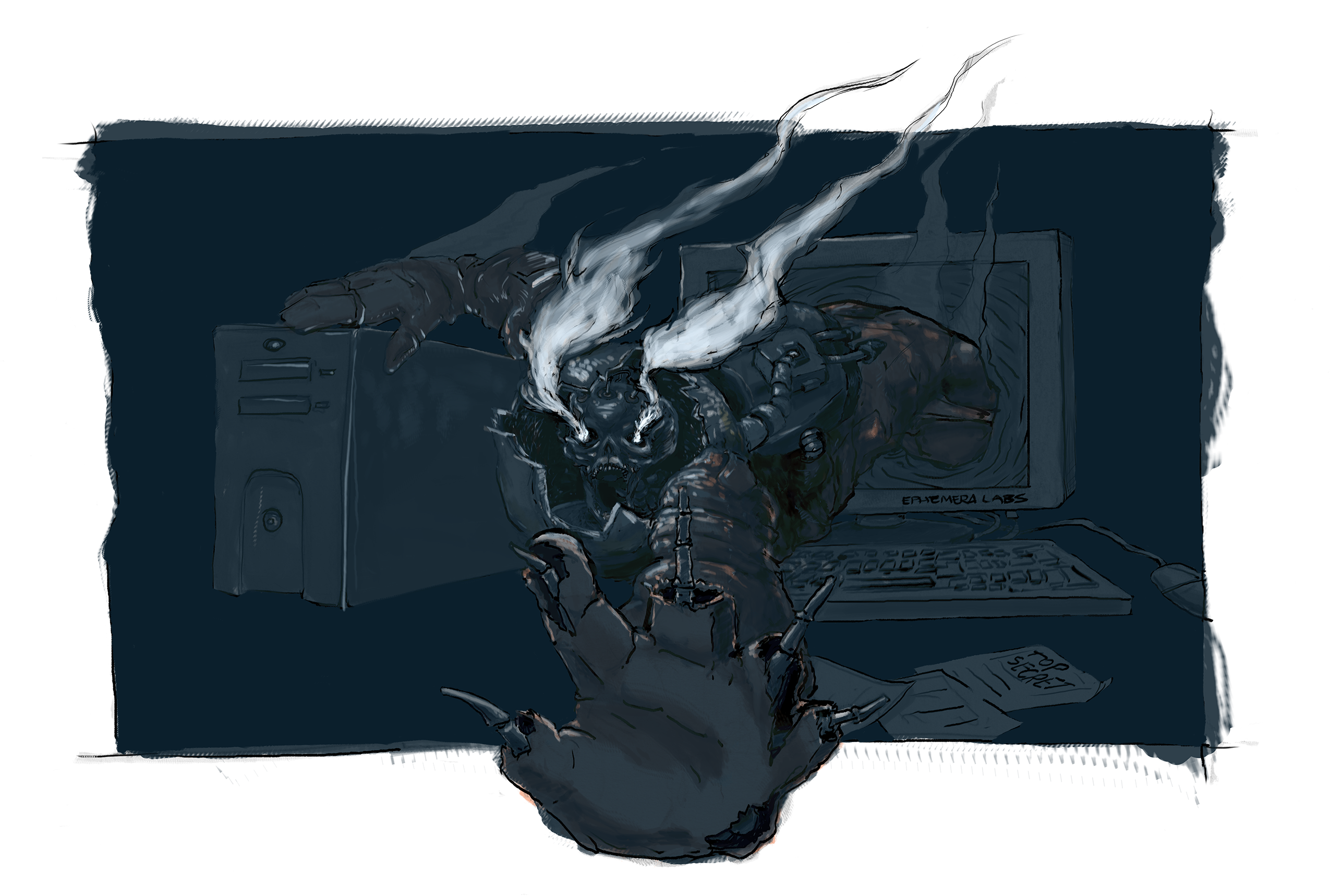 Border Gateway Phantoms are lost souls trapped within the Internet Protocol networks of the world, re-living the conflagration of their mortal ends and burdened by the inspiration, knowledge, and horrors of mankind. Adorned in the raiments of their death, they are charred, flaming corpses with embers that glow like an LCD screen in a pitch black room.